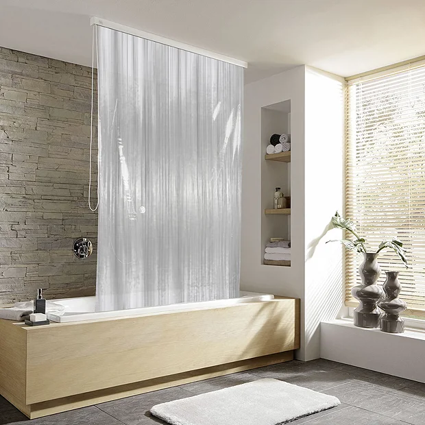 A stylish roller blind with Milky design from Kleine Wolke, this vinyl Waterproof blind is pulled up and down by a pull string, providing an innovative space saving solution for preventing water splashing from the shower area.