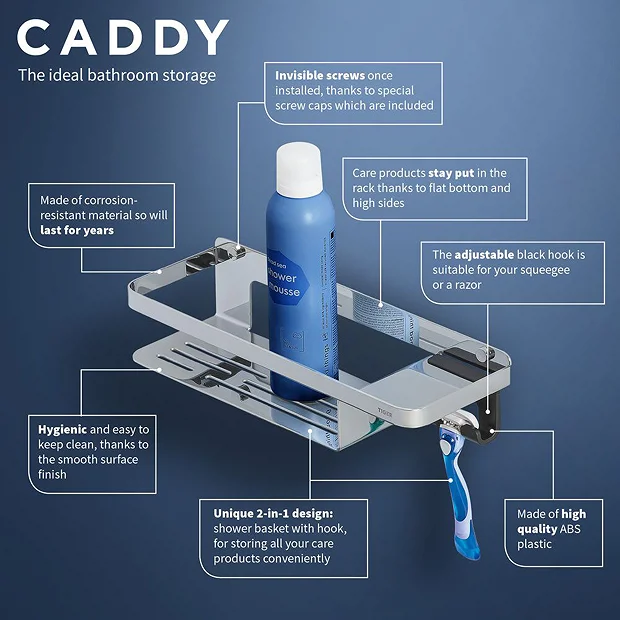 The Tiger Caddy Shower Basket with Hook is timeless, unique and multifunctional. In addition to your shower gel and shampoo, this 2-in-1 design also offers space for your razor, towel or squeegee. This way you can store everything neatly and always have your things within reach.