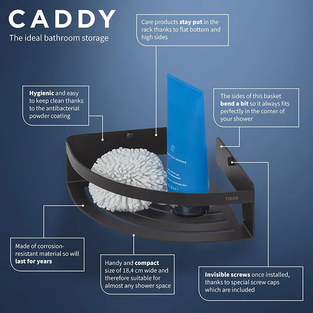 Give your bathroom a quick and smart update with the handy Tiger Caddy Small Corner Shower Basket. It is your personal assistant in the bathroom and immediately provides a feeling of relaxation. The flat bottom with a high edge ensures that toiletries remain firmly in the rack and the flexible sides ensure that it fits in every corner.