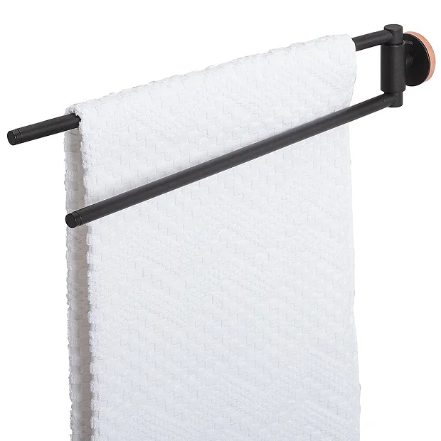 Take your bathroom to the next level with this Tiger Urban double swivel towel rail in matt black. The graceful arms move gracefully back and forth and offer space for two towels. Add color accents with the supplied decor rings in copper and grey.