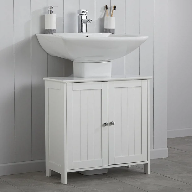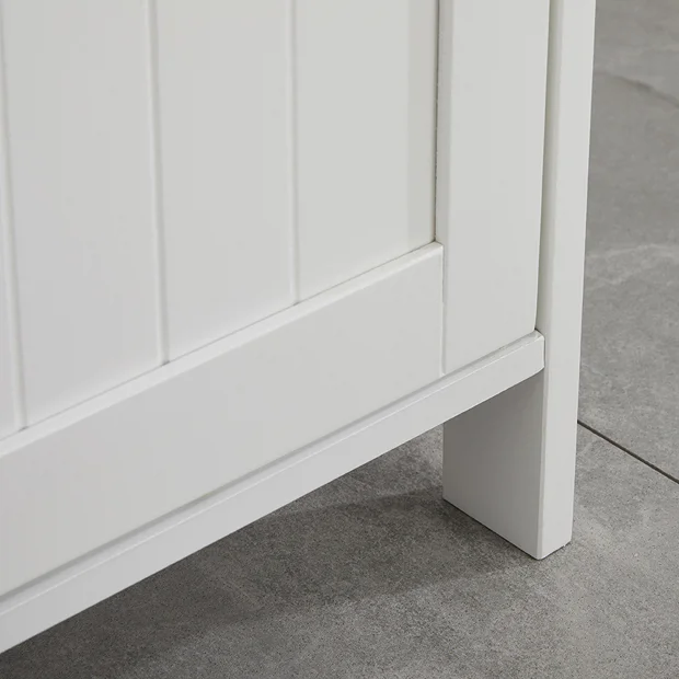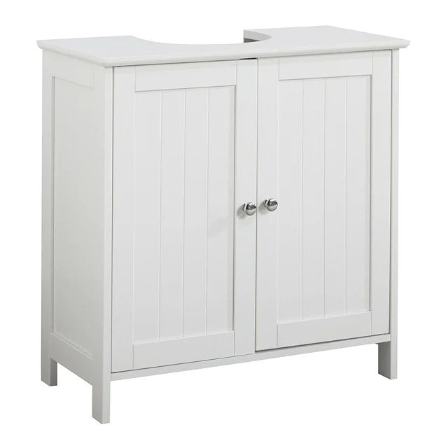 Add traditional design to your bathroom with the matt white under basin storage cabinet, features classic styling with a tongue-and-groove design. The under basin cabinet is a great space saver for the smaller bathroom or just to keep things neat and tidy! Provides generous storage space for your toiletries, helping to keep your bathroom clutter free. This under basin storage unit has internal shelving to store your bathroom essentials. Â
